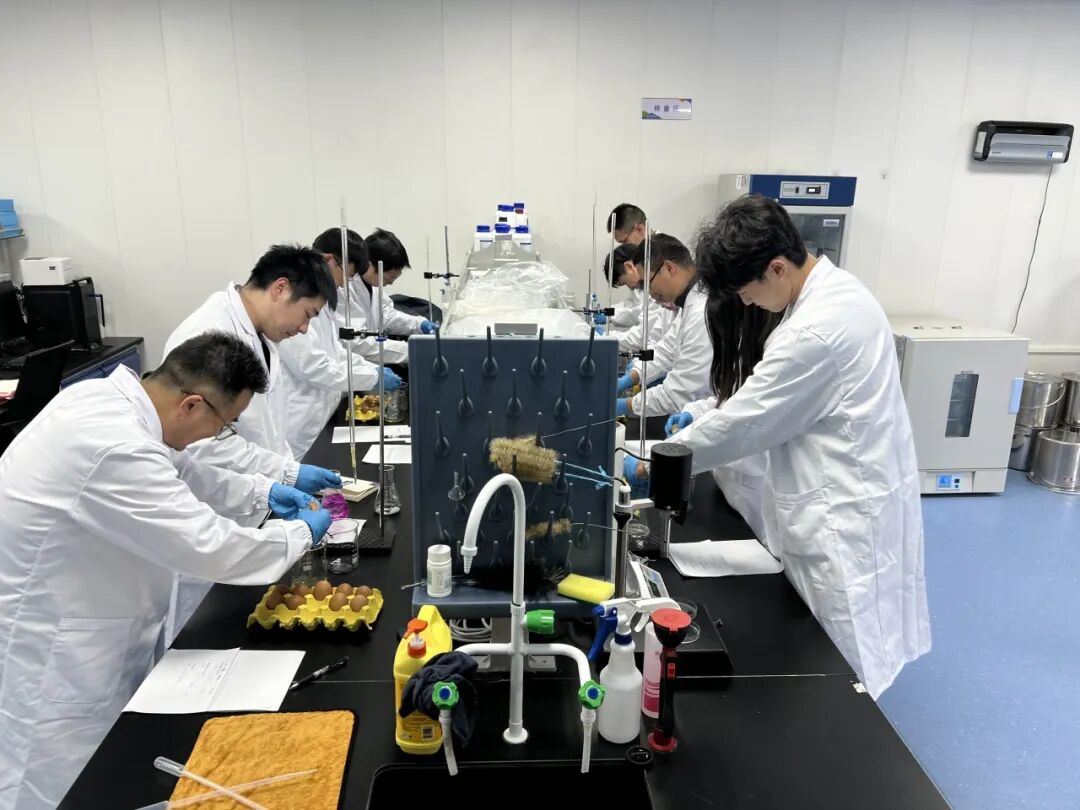 米來生物科技研發(fā)人員組成5個小組,圍繞“蛋黃收集”與“溶液標定”等環(huán)節(jié)開展技能競賽。活動從蛋黃蛋清分離與收集、精準標定未知濃度氫氧化鈉溶液等方面,考驗參賽選手的業(yè)務實操、化學實驗基本功與數(shù)據(jù)處理能力。競賽現(xiàn)場,選手們精準、高效完成各項任務,展現(xiàn)出高超技能水平和扎實專業(yè)功底。